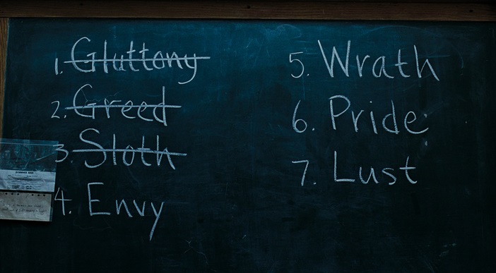 Bu yedi günahlar oburluk, aç gözlülük, tembellik, öfke, kibir, şehvet ve kıskançlıktır. 2. kurban bir avukattır ve cesedin olay yeri resimlerini avukatın eşine gösterdiklerinde tablonun ters asılmış olduğunu gören kadın, bu durumu dedektiflere söyleyecek ve tablonun arkasını incelediklerinde duvarda parmak izleri ile yazılmış yardım yazısını fark edeceklerdir.