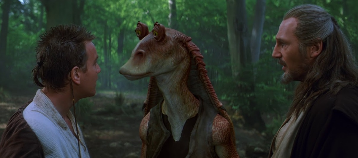Bu sırada uzun süre arkadaşlık edecekleri Jar Jar Binks isimli bir yerli ile karşılaşacaklar ve Jar Jar, onları suyun altında yaşayan gungan şehrine götürecektir. Burada gungan kralı ile görüşen jediler, Naboo gezegeni halkına yardım etmelerini isteyecekler ancak olumlu bir yanıt alamayacaklardır. Bunun üzerine jedilere bir gemi verecekler ve şehirden çıkmalarını sağlayacaklardır. Sakarlığı yüzünden kendi halkı arasından kovulmuş olan Jar Jar'da onlarla birlikte gidecektir ve derin suların içinden gemi ile yola çıkacaklardır.